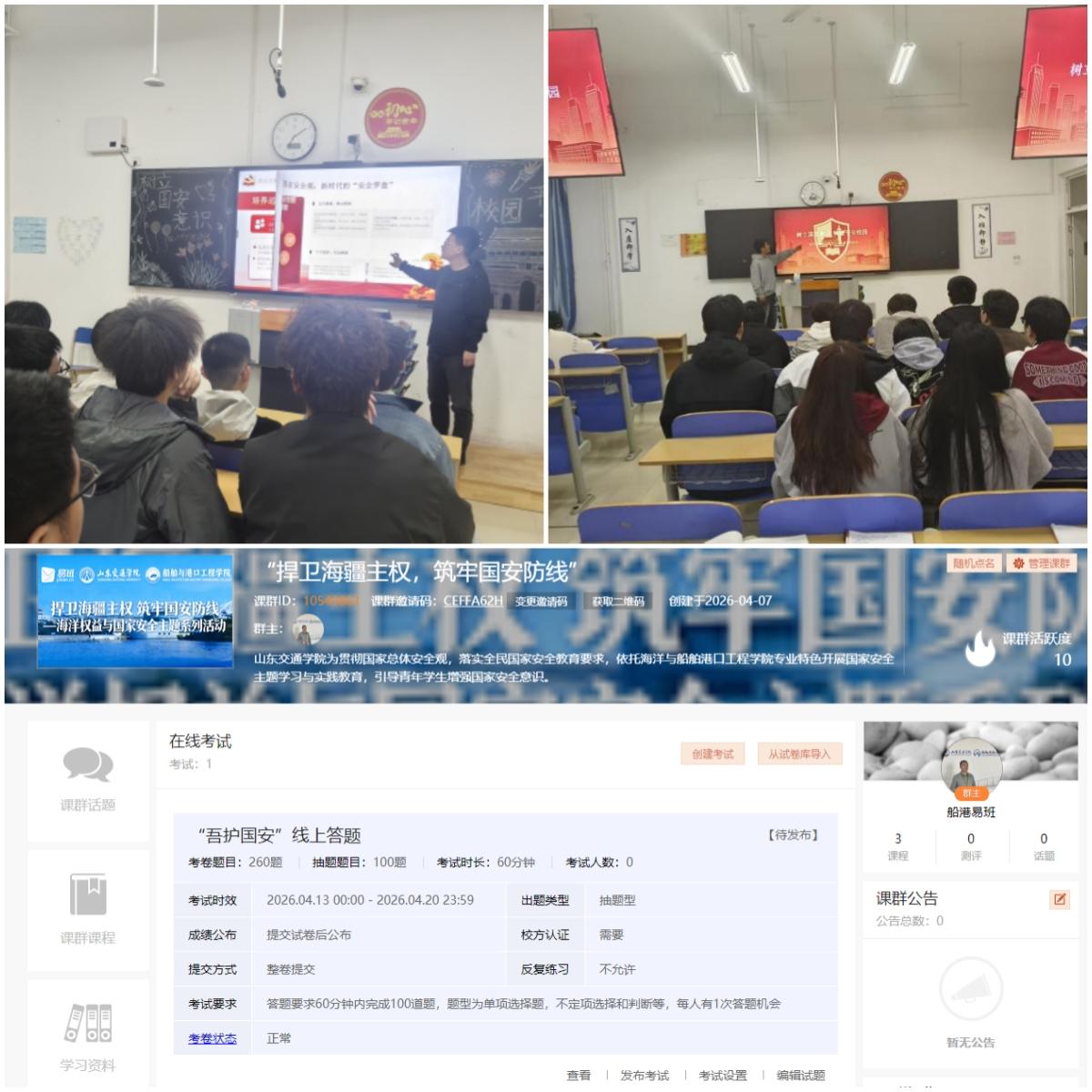 下午,学院组织各班开展“国家安全·青春担当”主题班会,各班结合地域文化历史、专业前沿特色、海洋权益安全等共同学习国家安全系列知识。此外,学院还通过线上易班思政平台,开展国家安全知识竞赛,丰富学习形式。